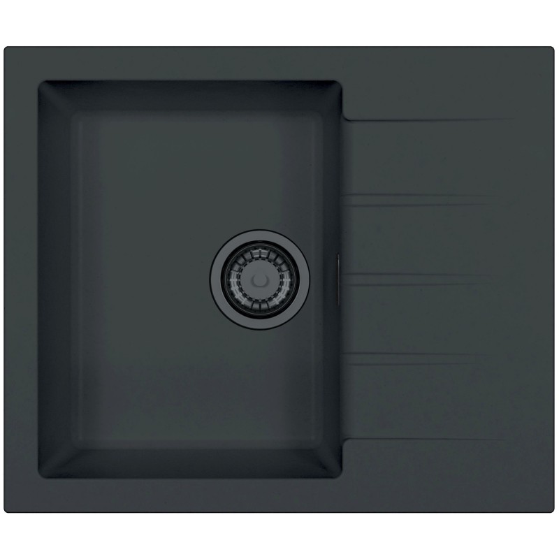 Granitový dřez s odkapem, provedení Deep Black A90 s černými komponenty, otočný, rozměr 590 x 500 mm, vana 325 x 425 x 200 mm, horní montáž, minimálně 45 cm skříňka, s excentrem, 2 otvory z výroby.