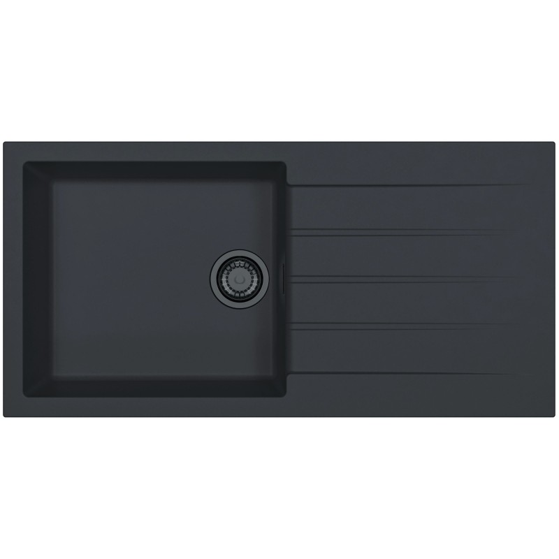 Granitový dřez s odkapem, provedení Deep Black A90 s černými komponenty, otočný, rozměr 1000 x 500 mm, vana 475 x 425 x 200 mm, horní montáž, minimálně 60 cm skříňka, s excentrem, 2 otvory z výroby.