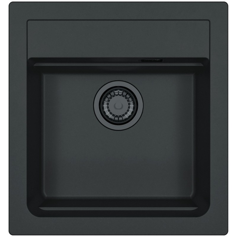 Hranatý granitový jednodřez, provedení Deep Black A90 s černými komponenty, rozměr 470 x 500 mm, vana 390 x 340 x 195 mm, horní nebo spodní montáž, minimálně 45 cm skříňka, s excentrem, 1 otvor z výroby.
